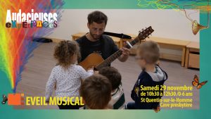 Cette séance d’éveil musical en famille proposée par Mathieu invite les tout-petits (de 0 à 6 ans) à découvrir le monde des sons et des instruments de musique.