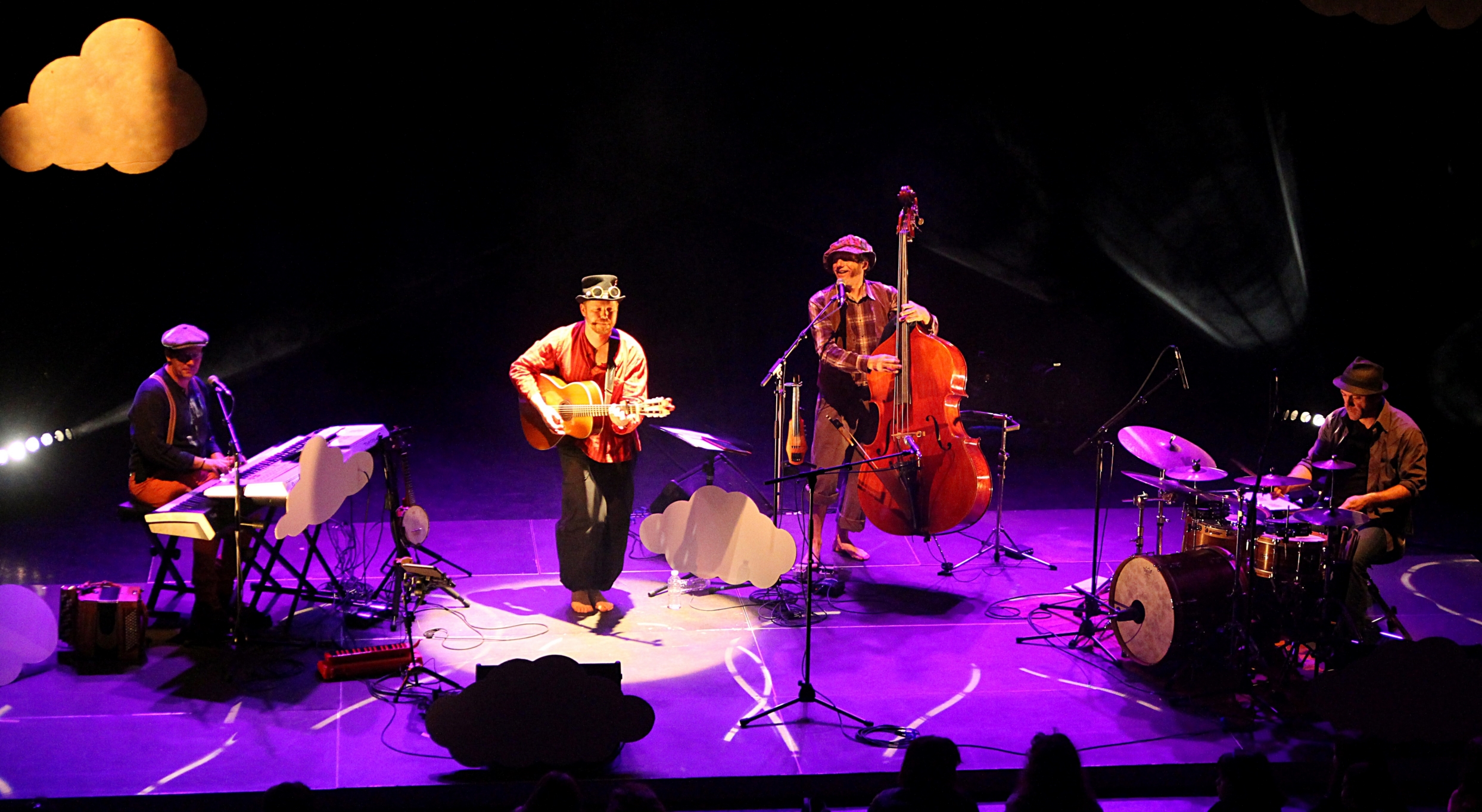 Mr Ribouldingue est un spectacle musical jeune public (3/10 ans), à la fois poétique et festif. Ces 4 musiciens vous invitent sur leur nuage à la rencontre de personnages frapadingues et d’animaux loufoques. Un spectacle sincère et joyeux pour petits, moyens et grands enfants.