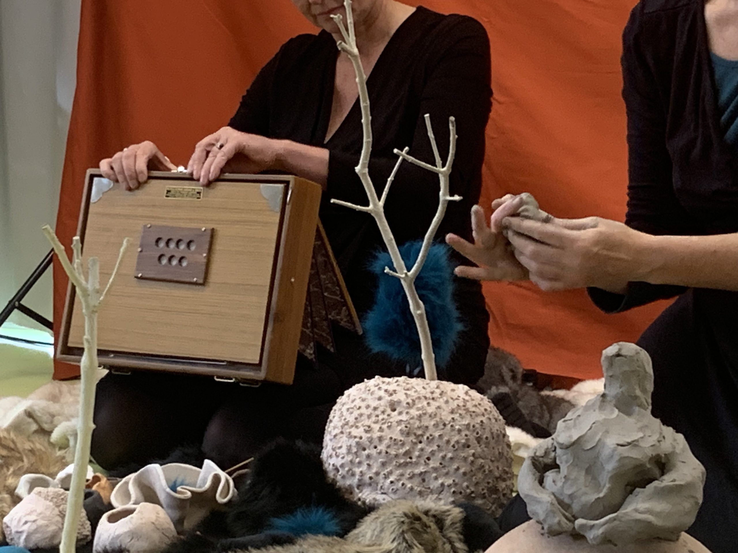 La créativité se développe au rythme de l’instant présent pour donner forme à un univers insolite où l’animalité semble être au rendez-vous. Puis, la voix de Guylaine Cosseron accompagnée de la shrutti-box et du looper se libère vers le chant et l’argile prend forme.